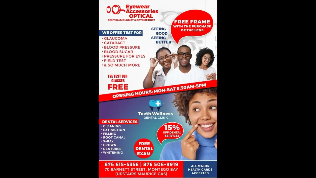 Eyewear Accessories Optical LTD and Teeth Wellness is a clinic that offers a comprehensive approach to health, combining ophthalmological and dental services in a modern and welcoming space located at 70 Barnett St, Montego Bay, Jamaica.